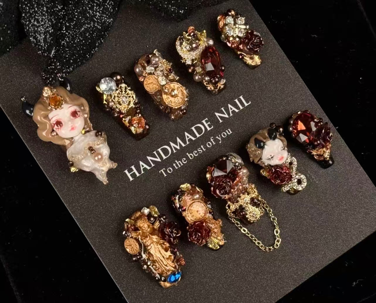 Each ManiRococo nail is a miniature canvas where Rococo elegance meets contemporary artistry. Hand-sculpted with meticulous attention to detail, every piece captures the ornate beauty of 18th-century European designādelicate florals, gilded accents, and sculptural elements that transform your fingertips into wearable masterpieces. These are not simply nails; they are tiny works of art, crafted to tell a story with every gesture.